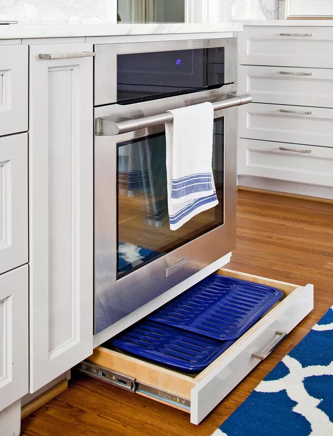 Một ý tưởng lưu trữ chảo dẹt thông minh khác là cất chúng trong ngăn kéo dài. Các ngăn lưu trữ ẩn này có thể được lắp đặt bên dưới tủ dưới, hoặc trong các thiết bị ở nơi thuận tiện nhất. Kích thước nông của ngăn kéo cũng hoàn toàn phù hợp để bạn cất các tấm nướng, chảo bánh pizza, hộp bánh nướng xốp,... Nếu cần, hãy sử dụng các tấm ngăn để chảo không bị va đập khi bạn mở ngăn kéo.