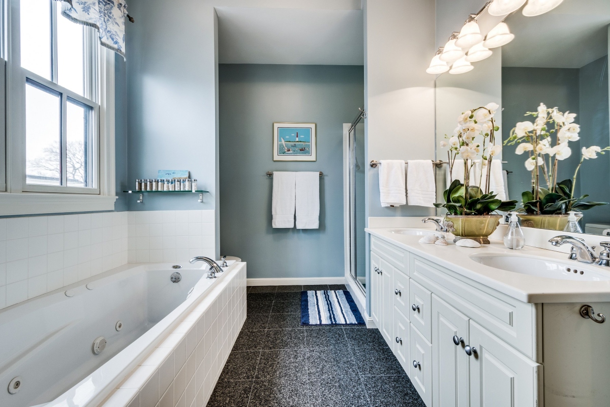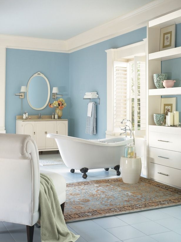 Phòng tắm là nơi giúp bạn thư giãn sau một ngày dài. Vì thế, lựa chọn cho nơi đây một màu sắc tạo ra một bầu không khí yên tĩnh là điều nên làm. Màu xanh lam được biết đến với tác dụng làm giảm nhịp tim và giảm huyết áp, vì vậy nó là một sự lựa chọn tuyệt vời cho phòng tắm. Màu lục lam nhạt của Benjamin Moore là một tông màu sáng tuyệt đẹp, mở ra không gian và tạo cảm giác thoáng đãng. Chúng cũng tạo thêm một nét tươi mới, trông đặc biệt đẹp so với đá cẩm thạch, giúp biến phòng tắm nhà bạn trở nên sang trọng và có cảm giác giống như một spa tại gia.