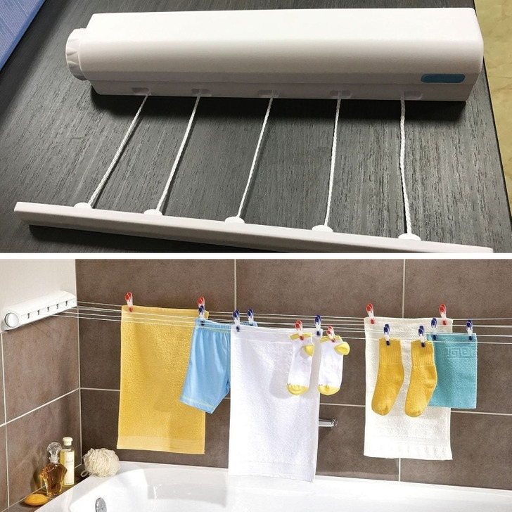 Ví dụ, một giá phơi đồ, giống như giá phơi đồ trên được gắn vào tường, sau đó bạn có thể kéo dây ra khỏi nó và gắn vào bức tường đối diện.