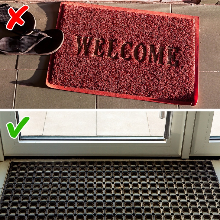 Thảm chùi chân cao su dày có thể không dễ nhìn, nhưng chúng là thiết thực nhất. Khi trời mưa bên ngoài, điều quan trọng là phải cạo sạch bụi bẩn trên giày trước khi vào nhà. Một tấm thảm chùi chân cao su với các vùng nổi lên trên bề mặt của nó sẽ giữ tất cả bụi bẩn bên trong.