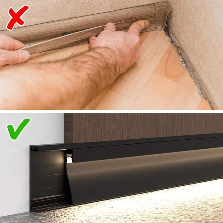 Ván ốp chân tường tiêu chuẩn có xu hướng bám nhiều bụi, nhưng nhiều người trong chúng ta vẫn lắp đặt chúng theo thói quen. Trong khi đó, có những tấm ốp chân tường ẩn lại tiện lợi hơn nhiều. Chúng không bám bụi do không có những chỗ lồi lõm và khoảng trống.