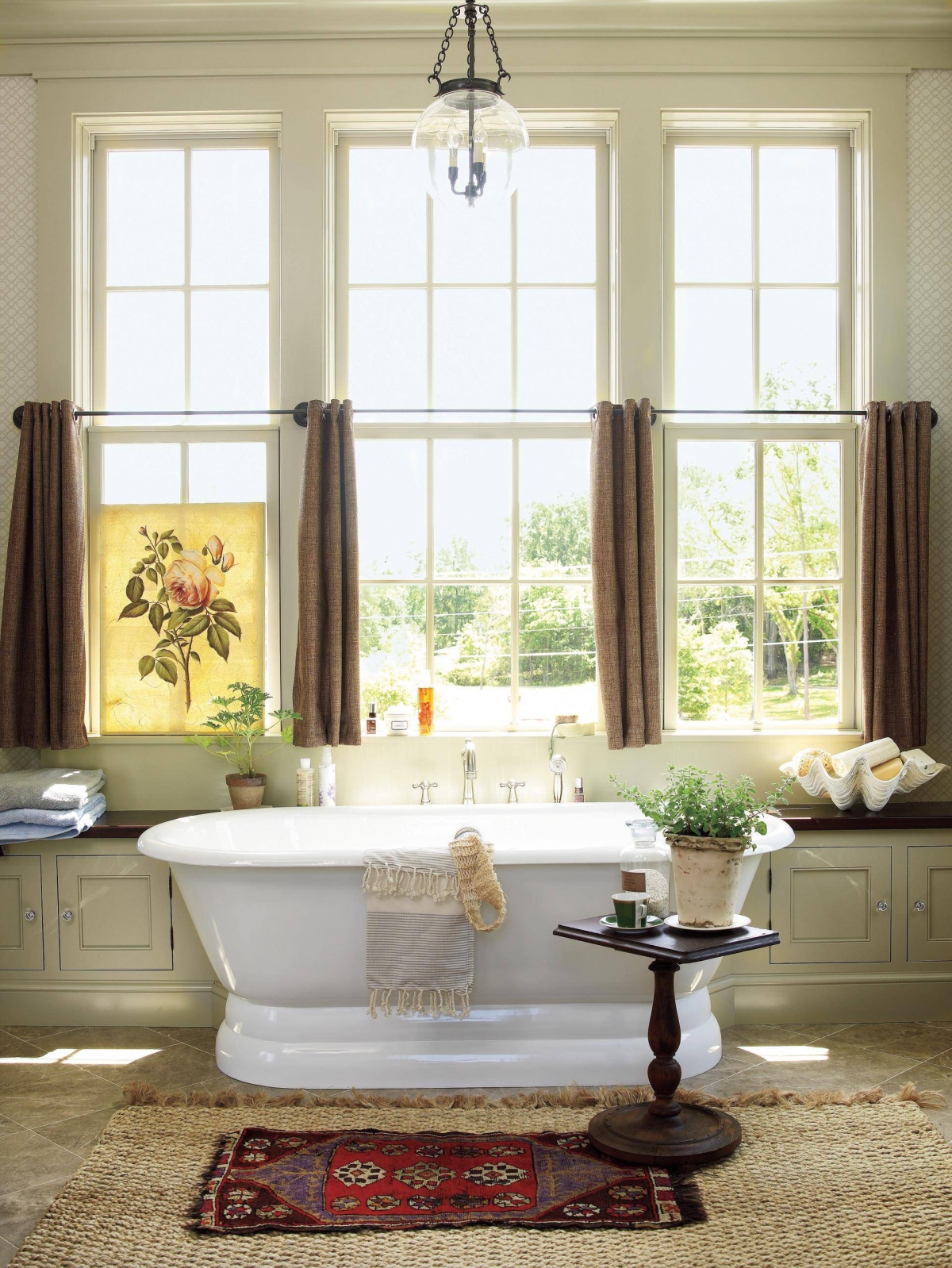 Rèm phòng tắm với gam màu trung tính ấm áp mang lại một khía cạnh hoài cổ cho căn phòng. Đồ đạc và bồn tắm độc lập mang lại cảm giác cổ điển, và tấm rèm họa tiết sẽ tạo thêm phần vui tươi. Hoàn thiện nhà tắm với một tấm thảm nhiều chi tiết để tăng cường và thêm thu hút ánh nhìn.