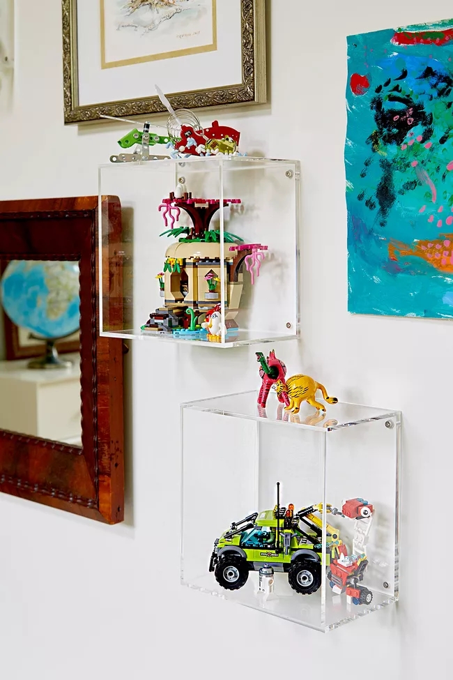 Biến đồ chơi thành tác phẩm nghệ thuật với ý tưởng lưu trữ này. Các hộp trưng bày acrylic được gắn trên tường tạo ra một nơi tôn vinh những sản phẩm sáng tạo của riêng con, hoặc đơn giản chỉ là đồ chơi yêu thích của trẻ. Trưng bày bên trong và bên trên để trang trí phòng của con bằng các tác phẩm thủ công của chúng.