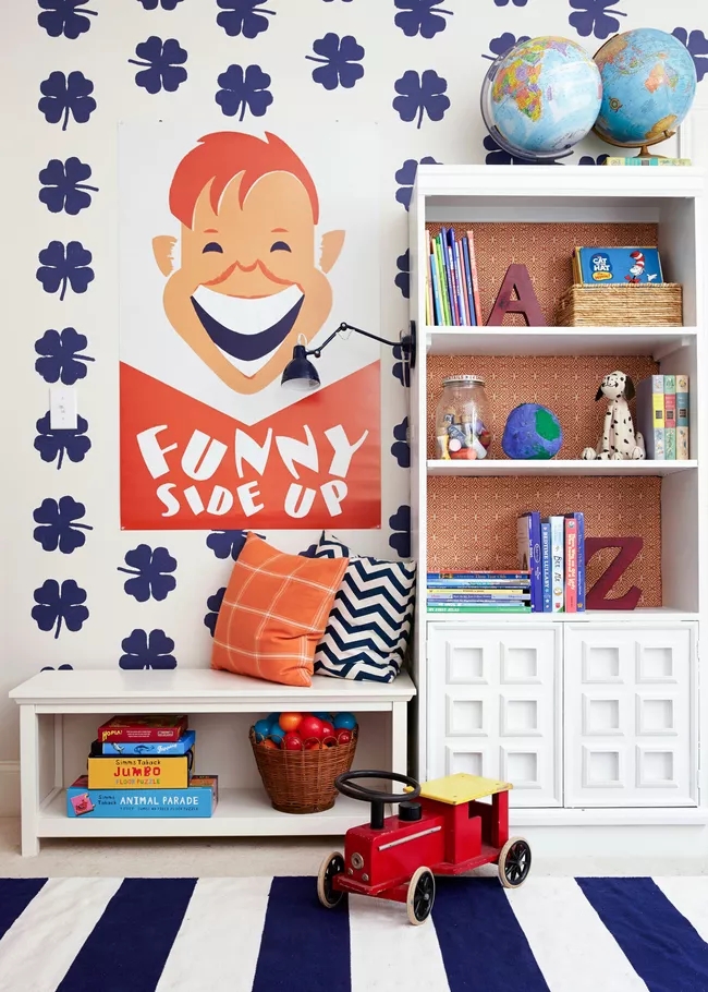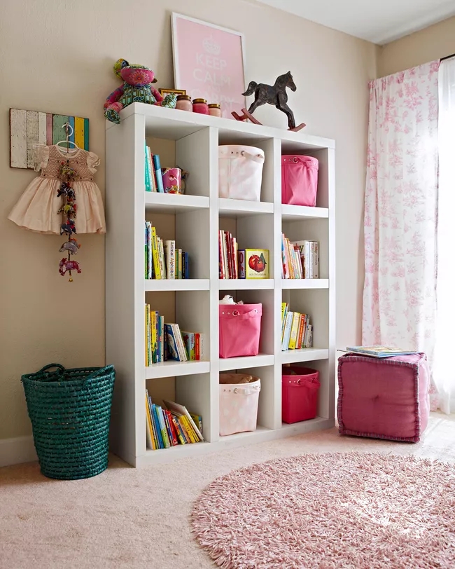 Một bộ tủ sách độc lập hoặc một hệ thống nhỏ có thể trang bị cho phòng của trẻ rất nhiều đồ lưu trữ và phong cách. Bộ sắp xếp đồ chơi đa năng cung cấp tùy chọn trộn và kết hợp các giỏ hoặc thùng cho cả cất giấu và lưu trữ mở. Tại đây, các giỏ được xử lý các vật dụng như đồ chơi sang trọng, đồ dùng nghệ thuật và đồ chơi nhỏ khác, trong khi các sở thích mở trưng bày những cuốn sách đầy màu sắc. Phần trên cùng của đơn vị cung cấp không gian trưng bày cho các tác phẩm nghệ thuật và đồ sưu tầm.