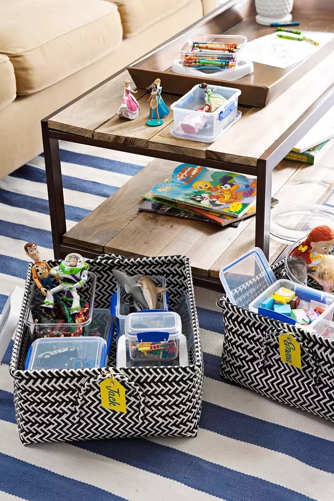 Giỏ có thể cung cấp lưu trữ đơn giản cho đồ chơi của trẻ. Loại giỏ đầy màu sắc sẽ cung cấp khả năng lưu trữ gọn nhẹ cho sách, đồ dùng nghệ thuật, đồ chơi sang trọng và các vật dụng nhỏ khác trong phòng chơi. Sơn màu cho các thùng với mục đích cụ thể, hoặc dán nhãn mặt trước của mỗi thùng để giúp thời gian dọn dẹp trở nên dễ dàng đối với các bạn nhỏ.