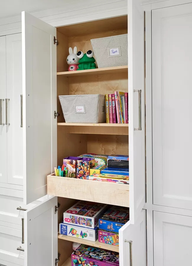 Cũng có thể dựa vào một tủ phụ hoặc một bộ tủ để cất giữ đồ chơi. Chúng mang đến vẻ ngoài hấp dẫn nhưng vẫn có đủ dung lượng lưu trữ cho các loại đồ chơi cồng kềnh ở bên trong.
