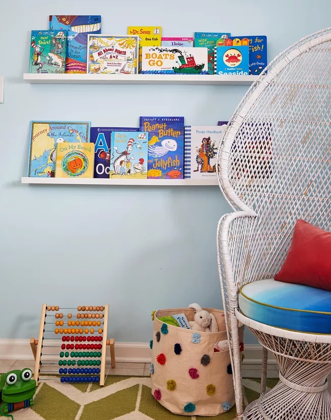 Ý tưởng lưu trữ dành cho trẻ sử dụng sách như một phần trang trí của căn phòng. Kệ sách sẽ giúp nâng đỡ một bộ sưu tập sách cho trẻ em đầy màu sắc, bên cạnh một chiếc ghế đọc sách ấm cúng. Cạnh trước nhô cao giúp sách không bị trượt khỏi giá.