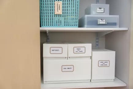 Dây điện tử có xu hướng cồng kềnh, và chúng có thể dễ dàng bị rối và gây lộn xộn. Vì vậy, hãy cân nhắc việc biến một tủ quần áo (hoặc một phần của tủ quần áo) thành không gian dành riêng cho các mặt hàng điện tử, chẳng hạn như bộ sạc dự phòng, dải điện, v.v. Tìm các hộp đựng có thể xếp chồng lên nhau để vừa với các món đồ của bạn và dán nhãn cho chúng để bạn có thể phân biệt cũng như dễ dàng tìm kiếm.