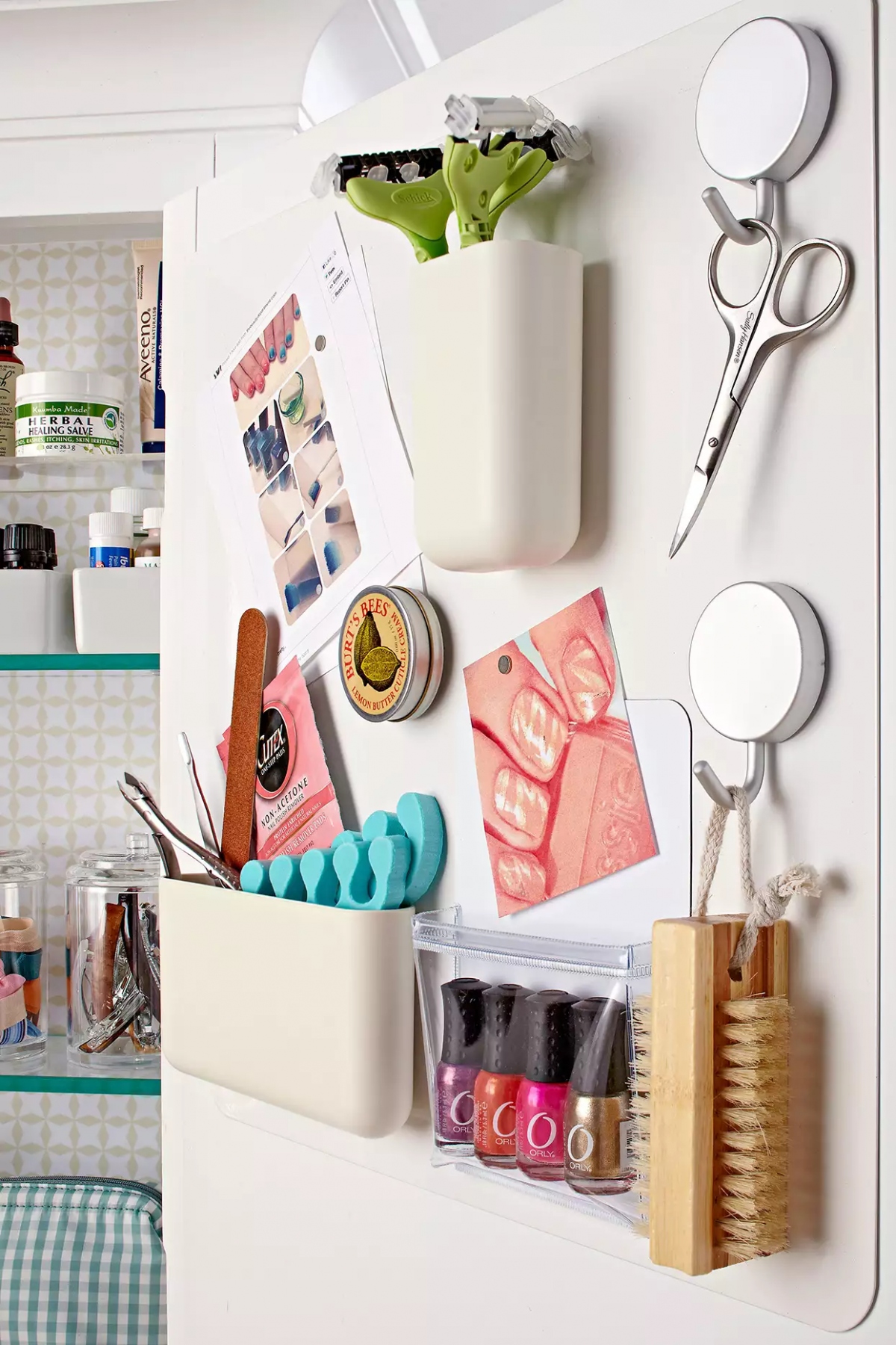 Nhắc đến lưu trữ, đừng bỏ qua việc tận dụng không gian của cánh cửa. Gắn thêm những chiếc móc nhựa, hay gắn thêm giá đỡ sắt để lưu trữ thêm đồ. Sử dụng móc hay giỏ gắn trên móc sẽ tiết kiệm thêm không gian mà bạn cũng không cần phải khoan hay đục tường, làm ảnh hưởng tới bố cục căn phòng. Ngoài ra, hãy đảm bảo sắp xếp các vật dụng một cách hợp lý để thuận tiện cho việc đóng, mở cửa.