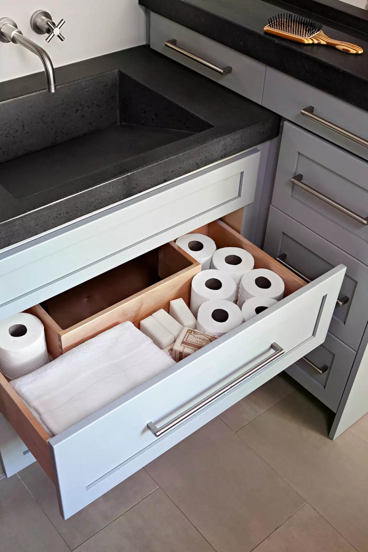 Ngăn kéo luôn là một ý tưởng lưu trữ tiện dụng cho bất kỳ nơi nào trong căn nhà. Tại phòng tắm, bạn có thể tận dụng những khoảng không gian như dưới bồn rửa, tủ đứng, tủ treo,... để thiết kế thêm ngăn kéo. Cách lưu trữ này cho phép bạn có thể làm sạch tầm nhìn, cất giữ những món đồ không muốn để lộ như giấy vệ sinh, hay những chai, lọ dầu gội, dưỡng thể,... chưa dùng tới.