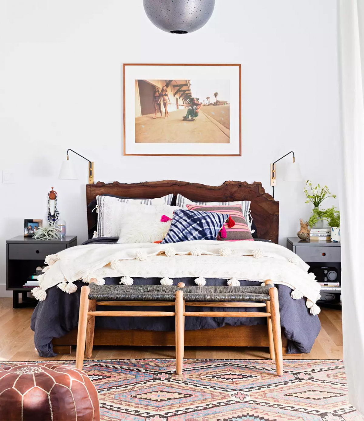 Nếu bạn muốn có cảm giác như đang ở trong môi trường nhiệt đới ngay khi thức dậy, hãy thử kết hợp với phong cách du mục. Họa tiết chiếc lá sẽ góp phần làm cho không gian thêm xanh mát. Thêm vào đó, hãy thể hiện sự tự do với phong cách bohemian bằng cách tạo điểm nhấn với chiếc tủ đầu giường khác lạ.