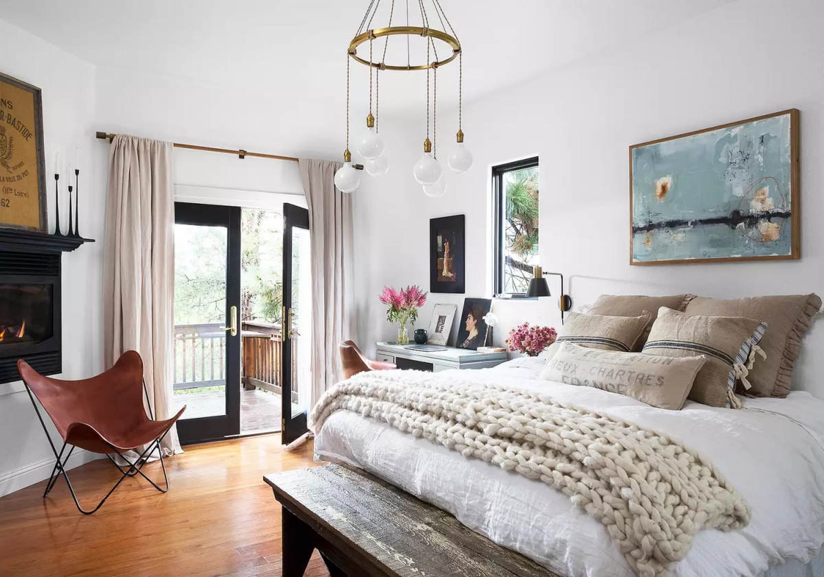 Không hẳn tất cả các phòng ngủ theo phong cách bohemian đều ngập tràn màu sắc tươi sáng. Thiết kế tập trung vào việc kết hợp các họa tiết tự nhiên và pha trộn phong cách thay vì dựa vào màu sắc rực rỡ. Hãy tạo những tiêu điểm tuyệt đẹp, độc đáo, thêm rèm cửa để bổ sung sự ấm cúng cho không gian.