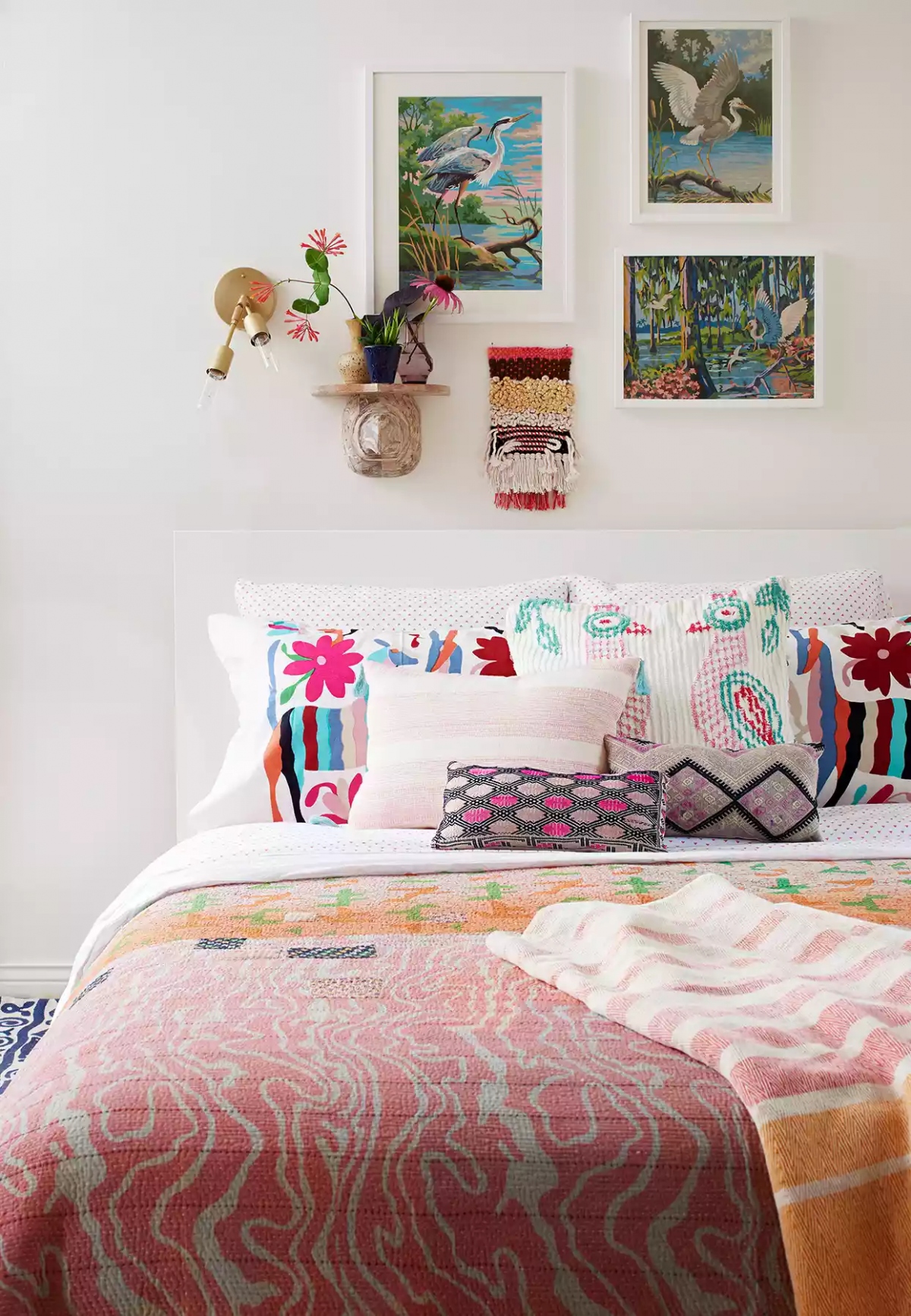Những bức tranh nghệ thuật đầy màu sắc và những chiếc gối có họa tiết dễ chịu, màu sắc tươi sáng sẽ khiến phòng ngủ trở nên lạ mắt, tạo nên bức tường phòng trưng bày độc đáo phía trên giường. Điểm nhấn là chiếc đèn treo tường bằng đồng tối giản, khéo léo trở thành một phần vừa vặn của sự kết hợp./.