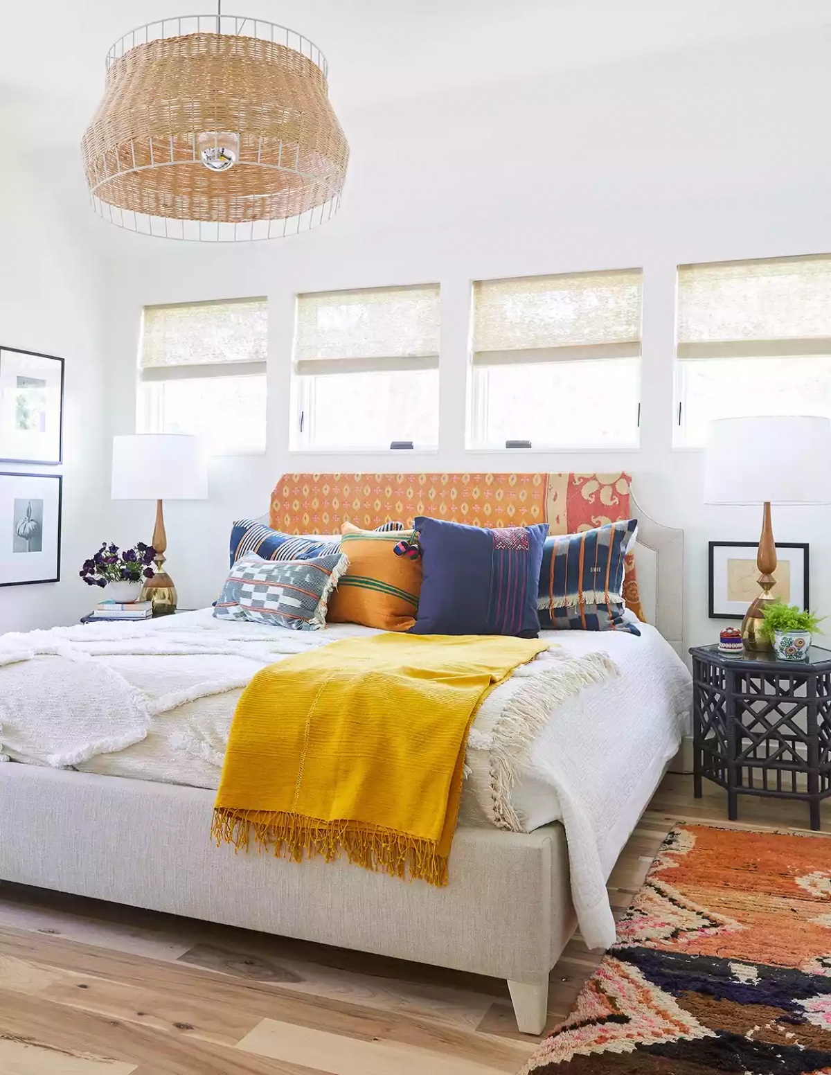 Màu xanh, màu vàng là lựa chọn phù hợp cho phong cách du mục tự do, phóng khoáng này. Những chiếc gối có họa tiết và một chiếc chăn có tua rua cỡ lớn sẽ tạo nên sự ấm cúng cho phòng ngủ. Để làm dịu các mảng màu đậm này, hãy thử kết hợp thêm một đồ vật có màu sắc nhẹ, mang đậm yếu tố tự nhiên. Bổ sung thêm tác phẩm nghệ thuật treo tường cũng sẽ giúp mang đến cho không gian một diện mạo sống động.