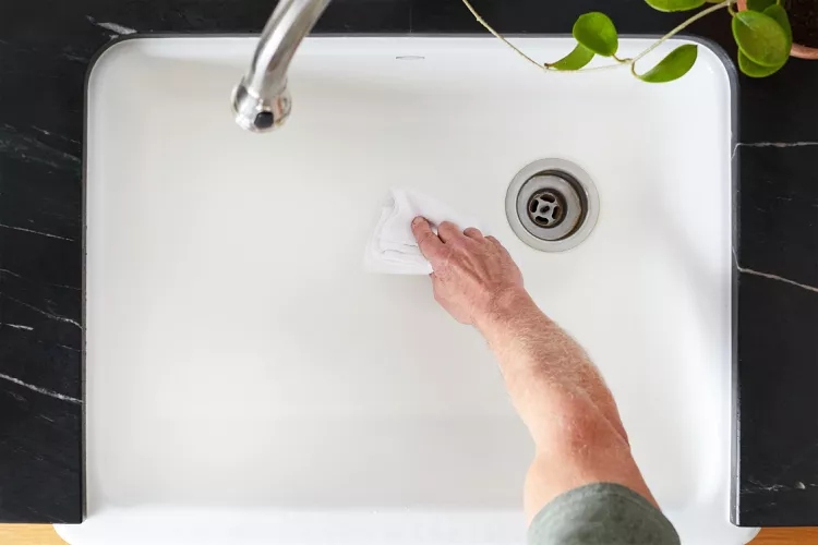 Nếu không có thời gian để rửa kỹ bồn rửa mỗi khi dọn bếp, ít nhất hãy lau sạch bồn rửa bằng chất tẩy rửa đa năng và một chiếc khăn để lau khô.