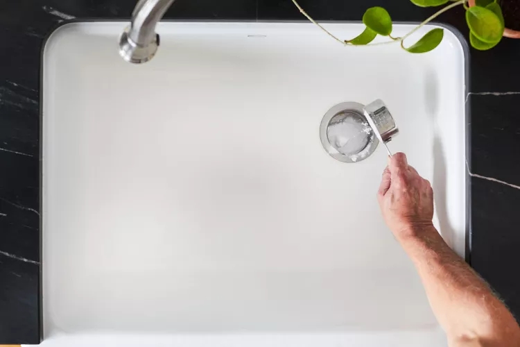 Đầu tiên, đổ khoảng nửa cốc baking soda vào ống. Tương tự với khoảng hai cốc giấm trắng, sau đó phủ một chiếc khăn lau bát đĩa để dung dịch được ngấm vào và nổi bọt. Chờ trong năm phút, sau đó rửa sạch bằng nước ấm và hỗn hợp đó đổ xuống cống thoát nước.