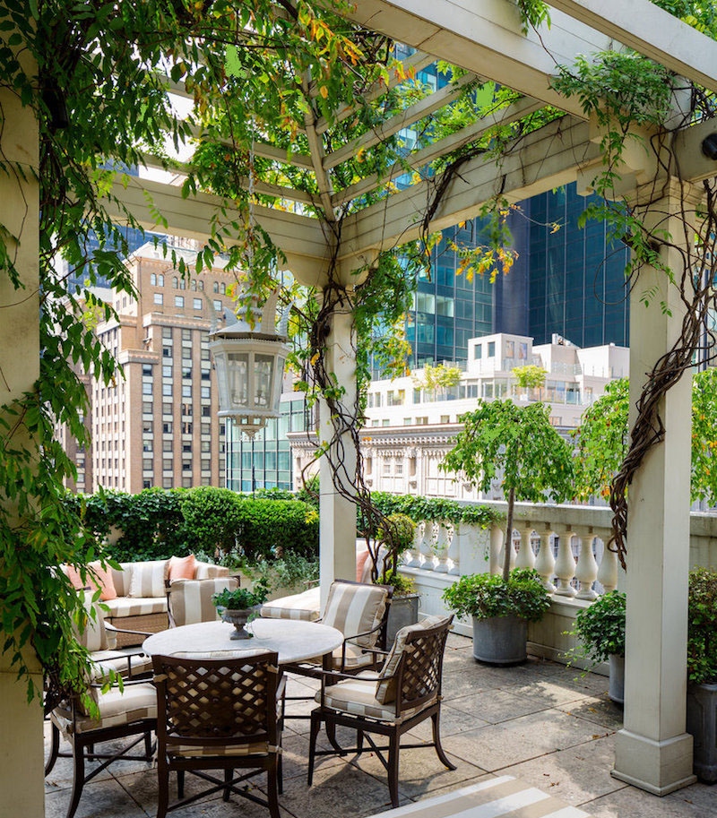Việc tận dụng những tán cây to có sẵn trong vườn làm thành những mái che là ý tưởng rất tuyệt vời. Nó vừa tiết kiệm chi phí lại không ảnh hưởng đến cảnh quan chung của khu vườn. Mái che bằng cây xanh được tạo ra từ việc cắt tỉa các loại cây leo giàn như hoa hồng, hoa giấy, hoa nhài...tạo thành những mái che xanh độc đáo. Cả nhà ngồi quây quần thưởng thức những cốc nước hoa quả trong những ngày hè oi bức dưới những mái che ấy thì sẽ tuyệt vời.