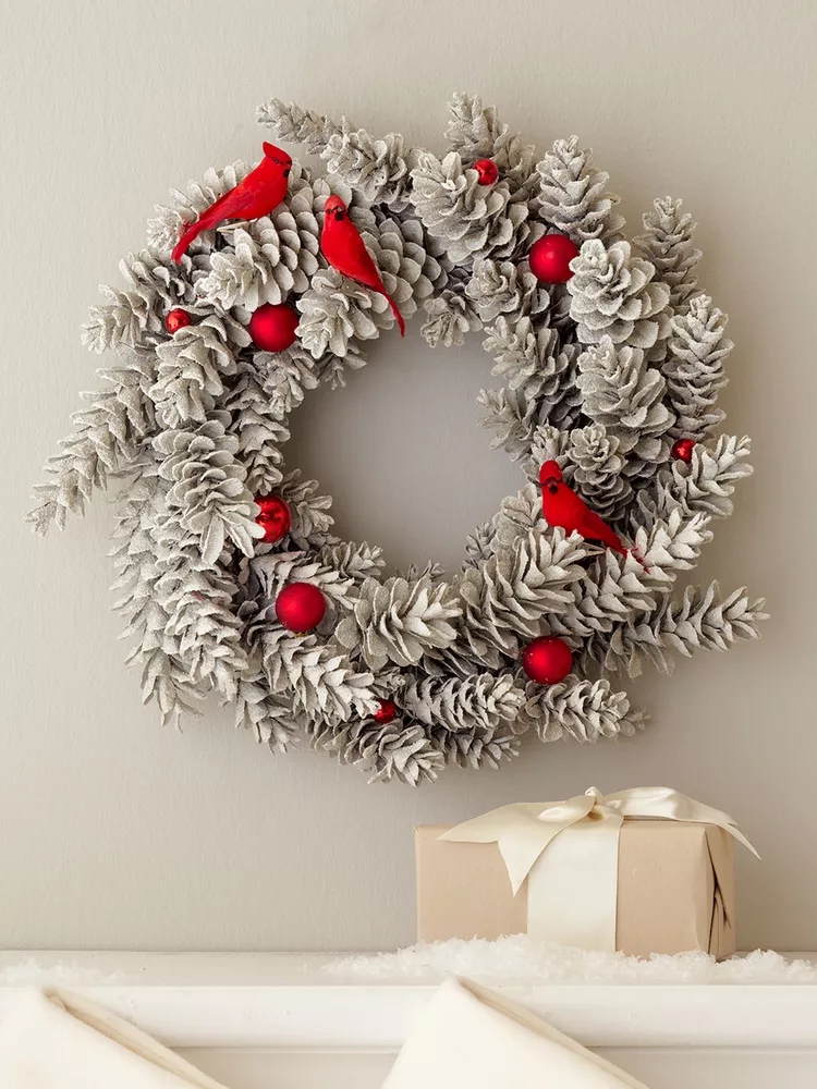 Không có bộ sưu tập trang trí Giáng sinh nào là hoàn chỉnh mà không có vòng hoa ngày lễ. Năm nay, hãy hoán đổi tán lá xanh cổ điển để lấy vòng hoa bằng nón thông phủ sương. Hãy để kết cấu lên tiếng và giữ cho trang trí đơn giản với đồ trang trí màu đỏ. Treo nó trên cửa trước nhà để chào đón khách hoặc tạo điểm nhấn phía trên lò sưởi.