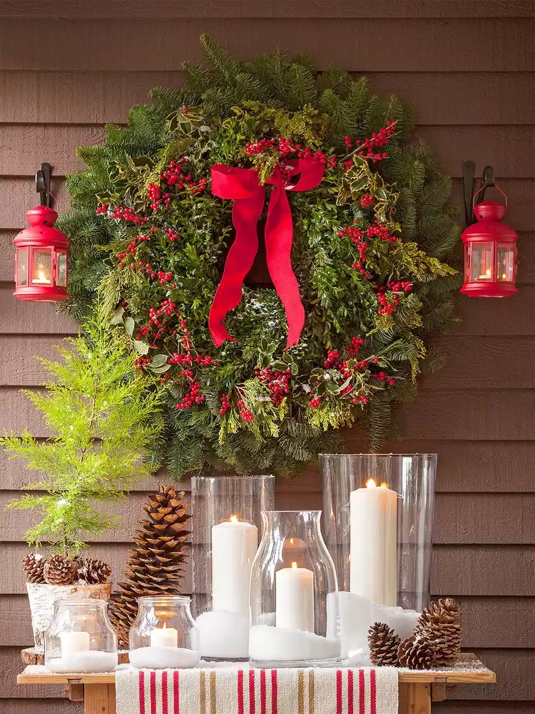 Chào đón những vị khách đến chơi trong ngày nghỉ lễ với màn trình diễn ánh nến rực rỡ. Thu thập nhiều loại lọ nến thủy tinh và lấp đầy chúng bằng tuyết giả. Cắm một cây nến trụ vào giữa mỗi chiếc bình và xếp chúng trên bàn bên cạnh hoặc dọc theo bậc thềm trước nhà. Bạn cũng có thể mang chúng vào trong nhà để thắp sáng xung quanh cho bữa tiệc Giáng sinh của mình. Những chiếc đèn lồng đỏ và một chiếc nơ đỏ là điểm cuối hoàn thiện phong cách Giáng sinh cổ điển này.