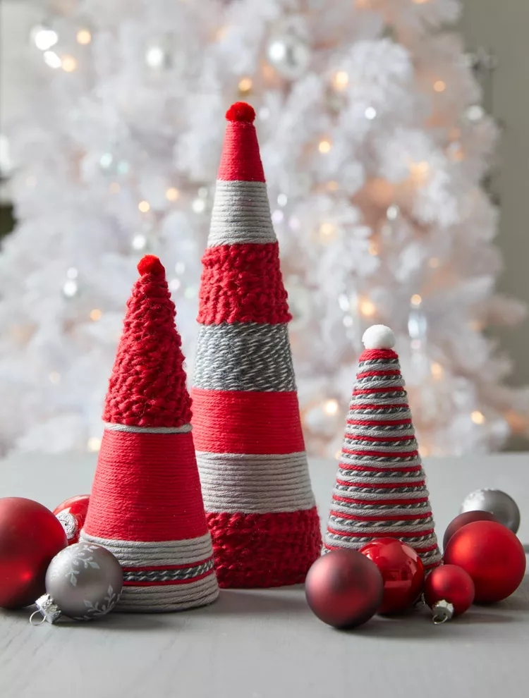 Đồ thủ công Giáng sinh thân thiện với ngân sách này tạo nên một điểm nhấn nổi bật cho bàn hoặc lò sưởi. Tất cả những gì bạn cần là nhiều loại sợi màu đỏ và trắng, bìa cứng để làm cấu trúc hình nón, quả bông tròn để làm ngọn cây và một ít keo chắc chắn để giữ tất cả lại với nhau. Rải một số đồ trang sức xung quanh để có một lễ hội rực rỡ cuối cùng.