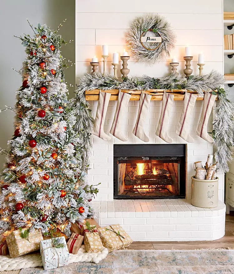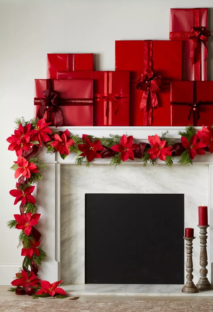 Nếu bạn đang tìm kiếm động lực để hoàn thành việc mua sắm và gói quà Giáng sinh vào đầu năm nay, hãy kết hợp những món quà ngày lễ vào trang trí. Được bọc trong giấy đỏ bóng và buộc bằng ruy băng mượt, những món quà Giáng sinh tạo nên một món đồ trang trí Giáng sinh nổi bật cho lò sưởi.