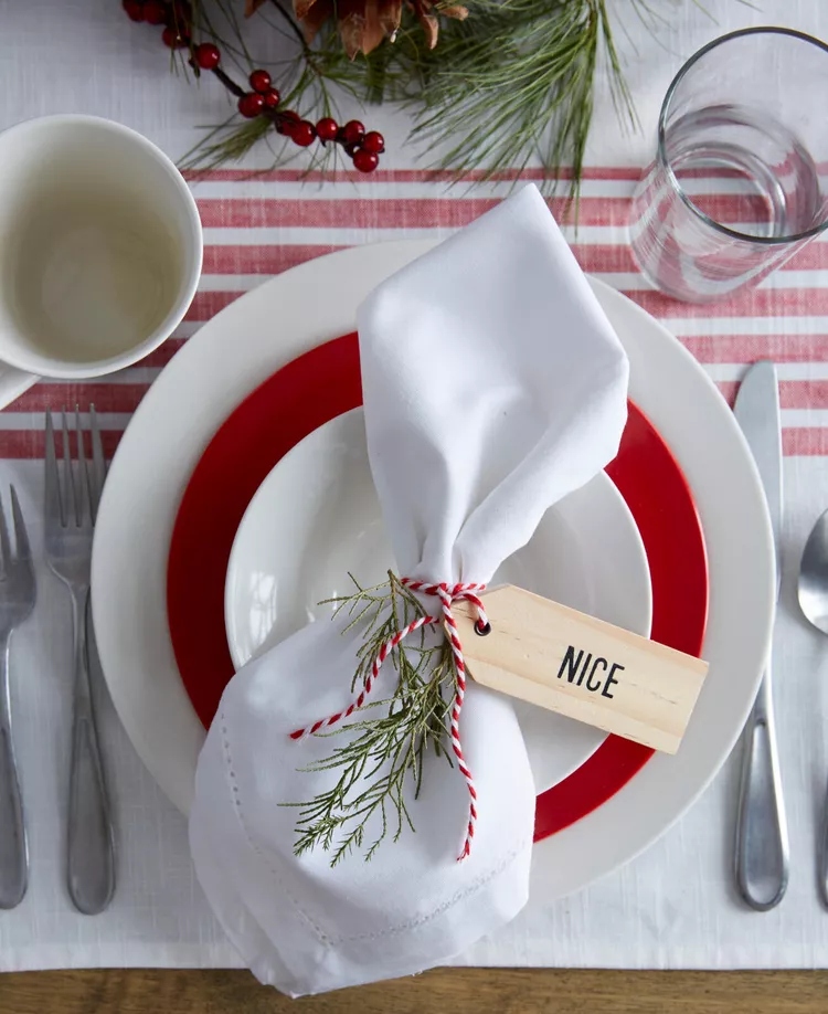Khi những vị khách trong kỳ nghỉ tụ tập, rất có thể chúng ta sẽ ngồi quanh bàn. Cho dù đó là một bữa tiệc Giáng sinh hay chơi các trò chơi trên bàn, bàn bếp thường là trung tâm của các cuộc tụ họp trong ngày lễ. Tô điểm cho trung tâm của các hoạt động Giáng sinh với màu đỏ và trắng. Trải bàn bằng khăn vải lanh sọc và đặt mỗi nơi những chiếc đĩa màu đỏ và trắng đơn giản. Buộc các thẻ tên xung quanh khăn ăn bằng dây bện màu đỏ và trắng của thợ làm bánh và thêm một nhánh cây xanh để hoàn thiện đẹp hơn.