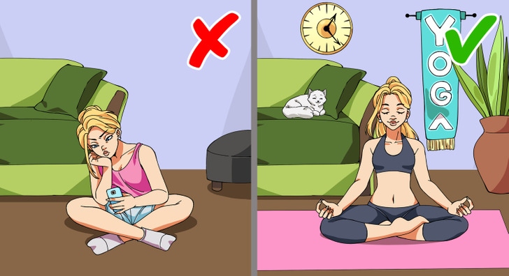Nếu mục tiêu của bạn là trở thành một Yogi (người thực hiện các bài tập Yoga một cách đều đặn và liên tục), nhưng phòng khách bạn luyện tập có những bức tường trắng nhàm chán và TV luôn bật, thì việc tìm kiếm động lực có thể rất khó khăn. Để thảm Yoga của bạn ở nơi dễ nhìn thấy, quy định chỉ bật TV theo một lịch trình nhất định và treo một tấm áp phích trên tường nhắc nhở bạn về việc tập luyện chẳng hạn.