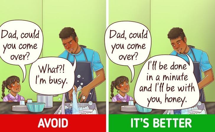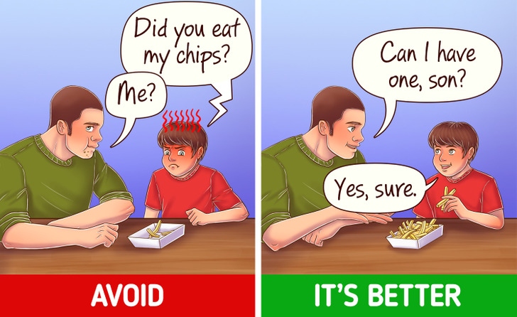 Đôi khi, người lớn quên quan sát cách chúng ta nói chuyện với trẻ nhỏ. Hãy nhớ rằng, cách bạn nói chuyện sẽ đều ảnh hưởng đáng kể đến hành vi của con. Giọng điệu của bạn là tất cả: không la hét và không xúc phạm. Thay vào đó, tốt hơn hết là nên phản ứng bằng giọng điệu cảm thông, giọng nói bình tĩnh và thấu hiểu.