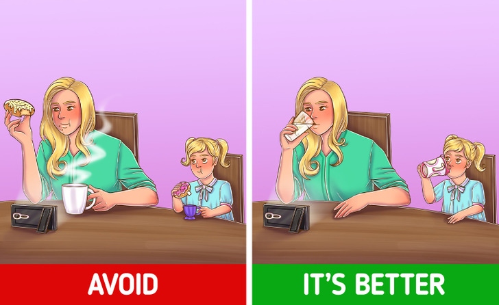 Hãy tự hỏi mức độ thường xuyên mà con cái thấy bạn ăn một chế độ ăn uống cân bằng, tập thể dục hoặc chăm sóc bản thân. Đó là những thói quen tốt cho cuộc sống mà trẻ có thể học từ bạn. Nhưng nếu trẻ thấy bạn lúc nào cũng ăn đồ ăn vặt hoặc chỉ uống không đủ nước, chúng cũng sẽ học được điều đó. Điều hợp lý cần làm là dạy chúng những thói quen tốt theo chúng cả đời.