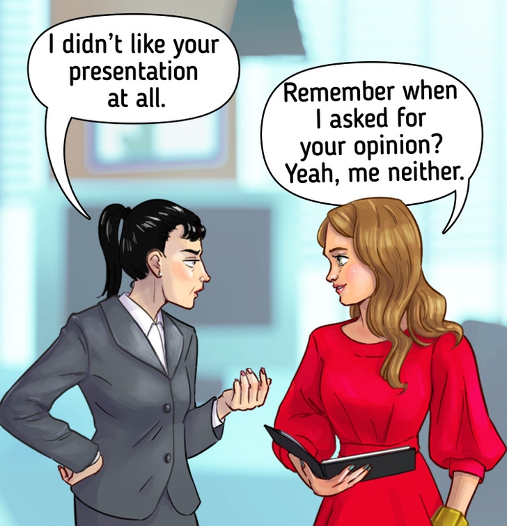 Người khác có thể nói ra ý kiến của họ với bạn mà không cần hỏi, nhưng khi giọng điệu mang tính phán xét, ý kiến của họ là thứ không mong muốn. Lựa chọn tốt nhất lúc này là bạn hãy giữ bình tĩnh và với giọng điệu tự tin, nói cho họ biết ý kiến đó là vô giá trị đối với bạn như thế nào. Bạn có thể thêm một nụ cười rất nhỏ vào cuối câu để thể hiện rằng bạn không cảm động chút nào trước sự thô lỗ ấy.