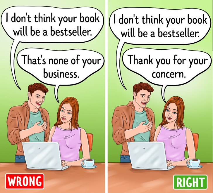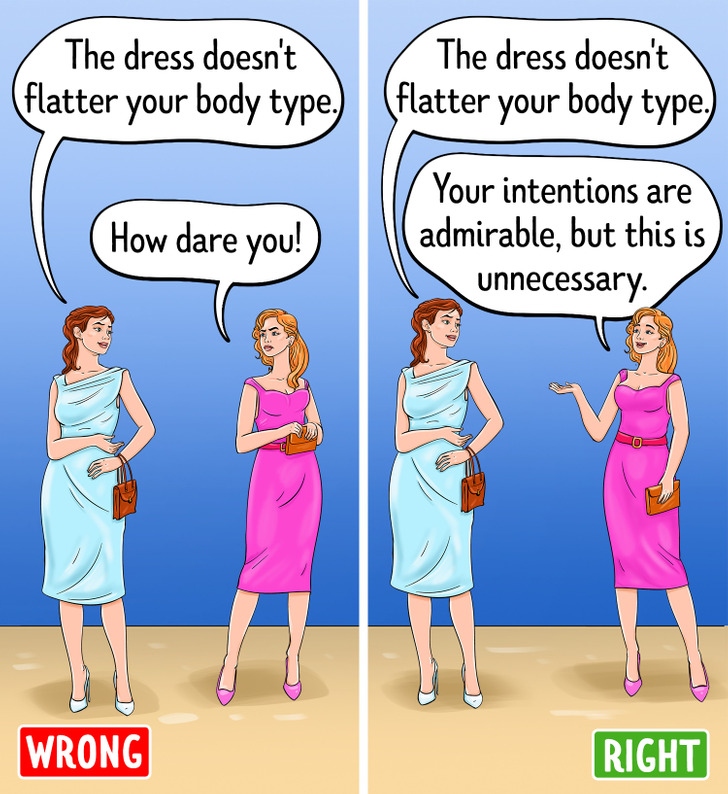 Nếu ai đó nói điều gì đó khiến bạn cảm thấy không thoải mái, bạn có thể đơn giản tìm điều gì đó khác để nói. Đây thường là một lựa chọn tốt khi một nhận xét không nhất thiết phải xảy ra khi nó gây tổn thương hoặc xúc phạm, thậm chí mang tính xâm phạm và quá riêng tư để bạn nói về nó. Người kia có thể sẽ làm theo sự dẫn dắt của bạn và bắt đầu một cuộc trò chuyện mới về điều gì đó khác. Đó là cách bạn giữ yên tâm và tránh sự bất đồng.