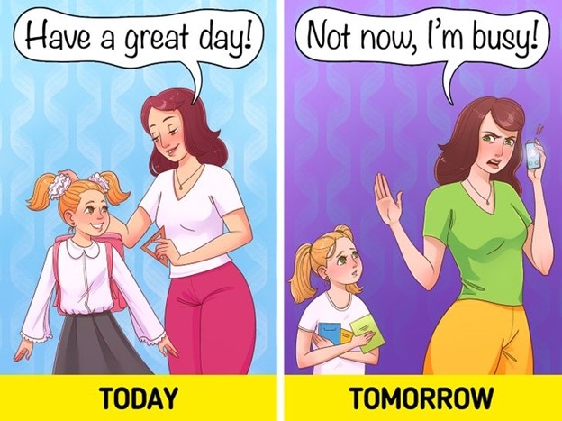 Những hành động hay cử chỉ tình cảm là điều bạn làm để duy trì mối quan hệ của mình với ai đó. Trong một gia đình có cha mẹ chưa trưởng thành về mặt tình cảm, gánh nặng của công việc này sẽ đổ lên vai đứa trẻ. Nhiệm vụ của trẻ là khắc phục một mối quan hệ căng thẳng, ngay cả khi lý do đó khiến trẻ trở nên căng thẳng mà không phải do lỗi của chúng. Mặt khác, cha mẹ của những đứa trẻ có thể không bao giờ thừa nhận họ đã sai và xin lỗi về hành vi của mình.