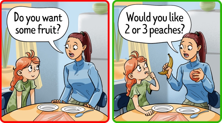 Nếu con muốn ăn một thứ gì đó, hãy để cho chúng được lựa chọn. Ví dụ, hãy hỏi "Con muốn ăn 3 hay 5 miếng?" Chúng có thể sẽ chọn số lớn nhất và cảm thấy bản thân như đã hoàn thành một điều gì đó. Bằng cách này, chúng không chỉ trở nên tự tin hơn mà còn có được sự độc lập. Nếu muốn lựa chọn lành mạnh hơn, hãy cắt một quả cam thành nhiều miếng và đếm chúng.