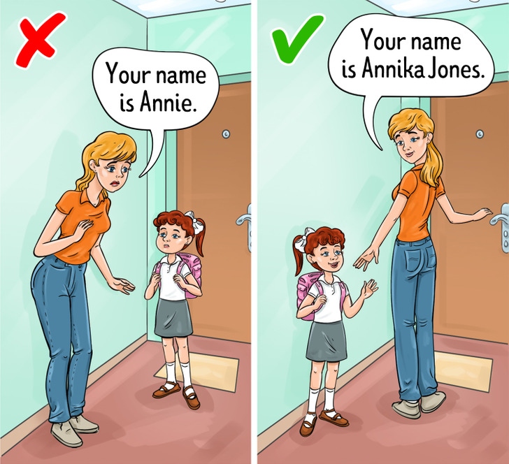 Có rất nhiều trẻ trong các trường mầm non, tiểu học không biết đầy đủ họ tên của mình. Nó trở thành một vấn đề trong lớp học khi có những đứa trẻ trùng tên, mà lại không biết họ của mình. Một số thậm chí không biết tên của vì luôn được gọi bằng biệt danh ở nhà. Bạn có thể chuẩn bị cho chúng đến trường bằng cách dạy chúng địa chỉ nhà riêng, số điện thoại nhà riêng và tên đầy đủ của bố mẹ.