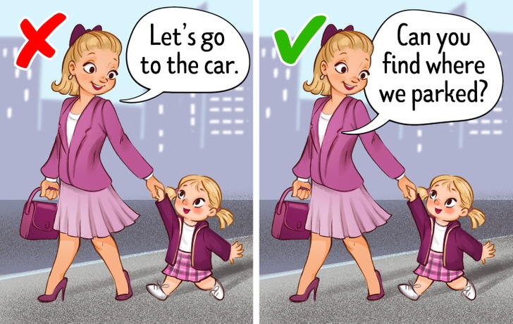Để con dẫn bạn đến ô tô hoặc trở về nhà bất cứ lúc nào đi ra ngoài đều có thể giúp chúng phát triển các kỹ năng dẫn đường và ghi nhớ. Điều này cũng sẽ giúp trẻ xây dựng được tính độc lập và tự tin. Cha mẹ đều có thể áp dụng mẹo này ngay cả khi đó là đi bộ đường dài, câu cá hoặc mua sắm.
