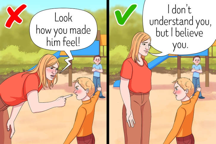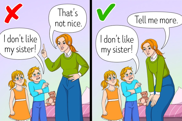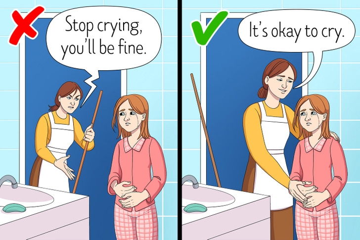 Nếu bạn nói với trẻ rằng trẻ nên ngừng khóc, thì trẻ có thể sẽ càng khóc nhiều hơn và nghĩ rằng mình phải ổn bằng cách ép buộc, khiến chúng hình thành sự thiếu tự tin và lo lắng về lâu dài.