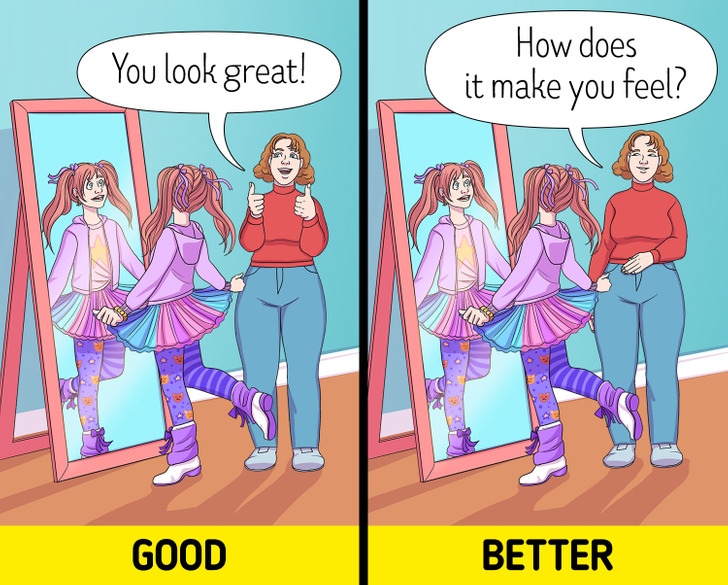 Không phải là một điều xấu khi nói "Trông con thật tuyệt" để đáp lại bộ trang phục mới của con, vì điều này có thể làm giảm sự lo lắng của chúng vào lúc ấy, nhưng về lâu dài thì không hẳn. Đôi khi, thay đổi câu trả lời có thể khiến con bạn nghĩ, 'Con cảm thấy tốt hơn khi mặc bộ đồ kia". Điều này khiến đứa trẻ phát triển được cảm xúc của riêng chúng về bản thân, thay vì lắng nghe người khác.