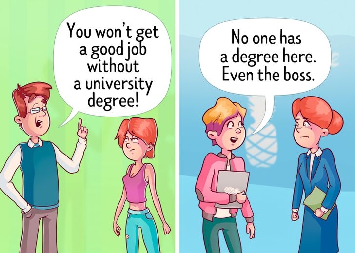 Cũng có xu hướng mới, khi có những ngành đòi hỏi kỹ năng và kinh nghiệm nhiều hơn là bằng đại học, nhưng mức lương vẫn cao. Đó là lý do tại sao có rất nhiều doanh nhân thành đạt, chuyên gia làm đẹp và nghệ sĩ không có bằng đại học.