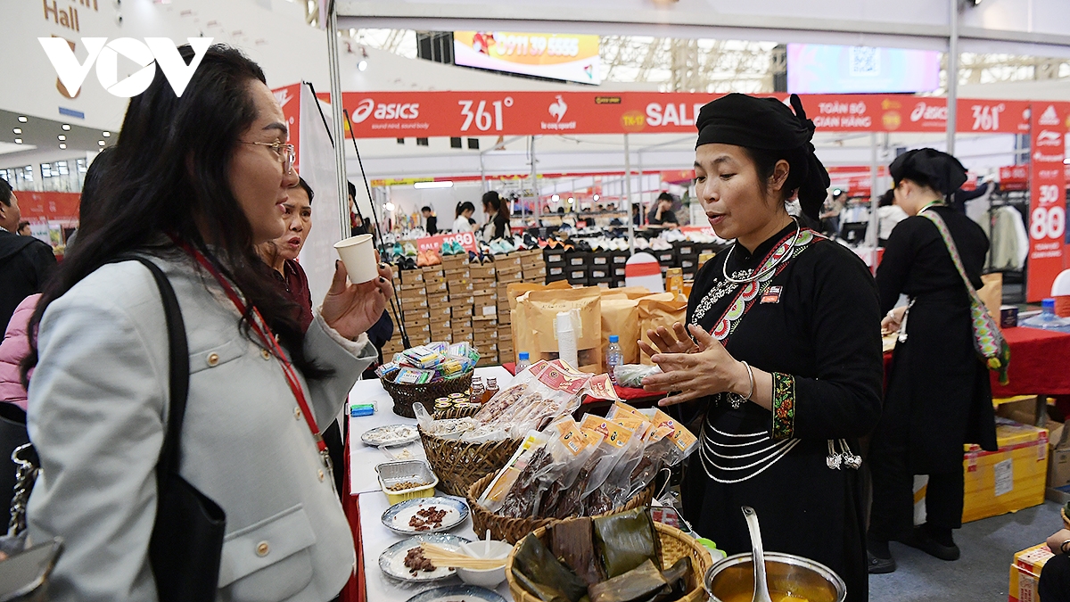 VOV.VN - Khách tham quan Hội chợ Mùa Xuân 2026 không thể không ghé thăm khu trưng bày đặc sản vùng cao Tây Bắc, từ những món ăn đặc sản trong mâm cơm của vùng cao như như thịt gác bếp, lạp xưởng gác bếp, xúc xích gác bếp, chẩm chéo, hoa quả, trà, cà phê… chinh phục thực khách bằng chất lượng và sự khác biệt văn hóa.
