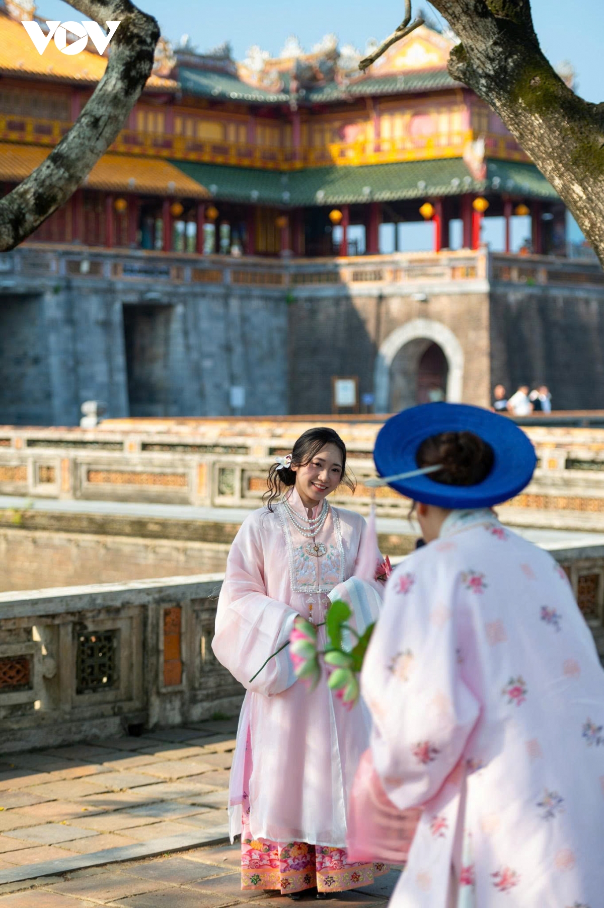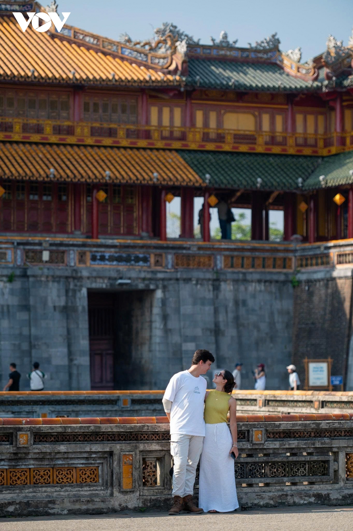 Trước khu vực Ngọ Môn cổng chính của Đại Nội Huế, không khí trở nên nhộn nhịp hơn với hình ảnh du khách check-in, lưu giữ những khoảnh khắc đáng nhớ.