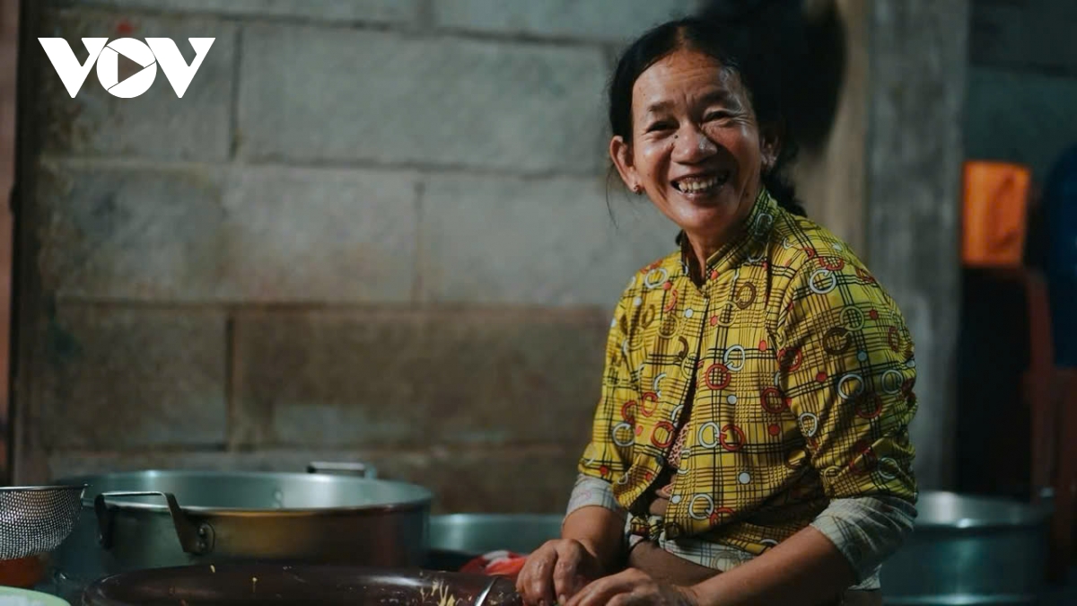Nụ cười đôn hậu của bà Neang Khen, người đã dành hơn một thập kỷ gắn bó với bếp lửa và những chiếc bánh bò mang hương vị quê hương.