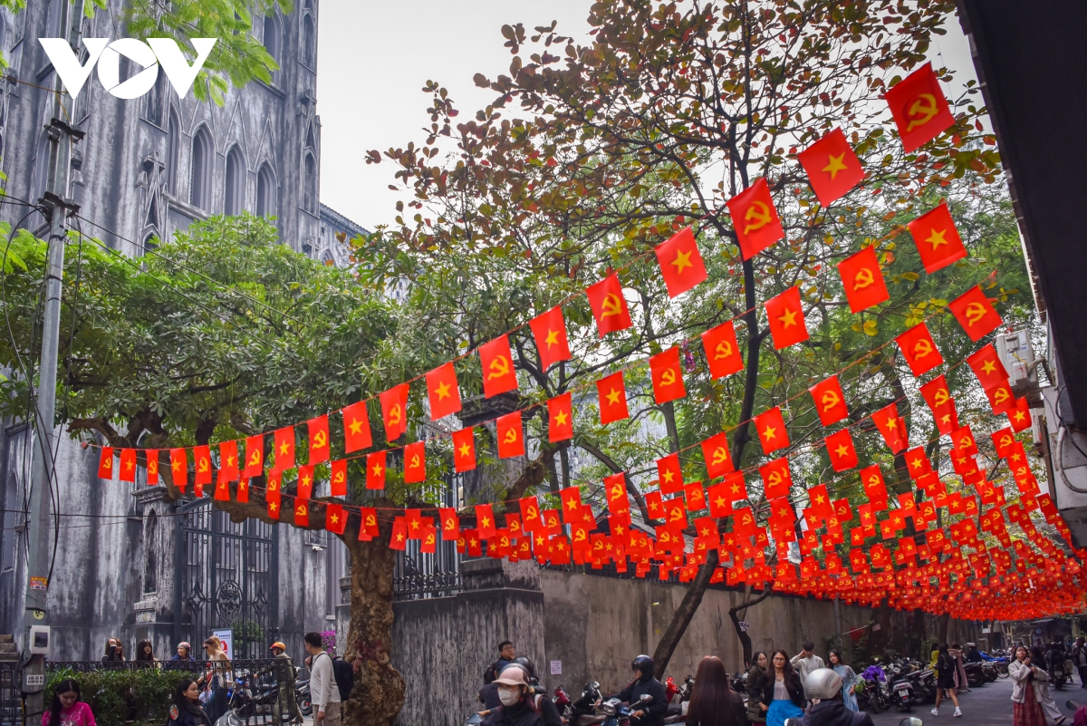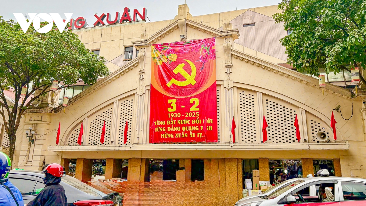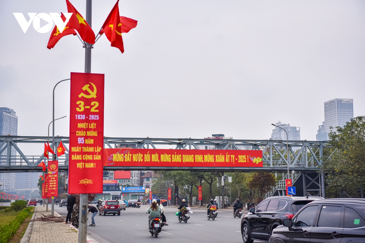 Nhiều tuyến phố tại Hà Nội rực rỡ cờ hoa, biểu ngữ chào đón xuân Ất Tỵ 2025.
