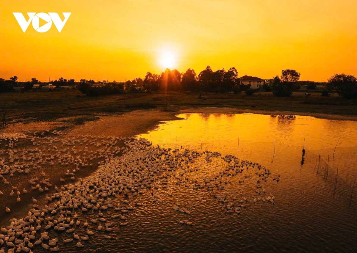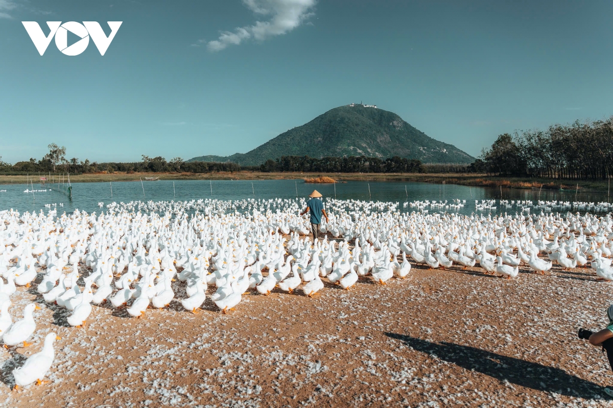 VOV.VN - Dưới chân núi Bà Đen, những đàn vịt đồng được chăn thả trải dài, phủ kín cánh đồng như trắng tuyết. Khung cảnh chăn vịt giữa thiên nhiên hùng vĩ khiến nhiều người không khỏi choáng ngợp khi lần đầu chứng kiến.