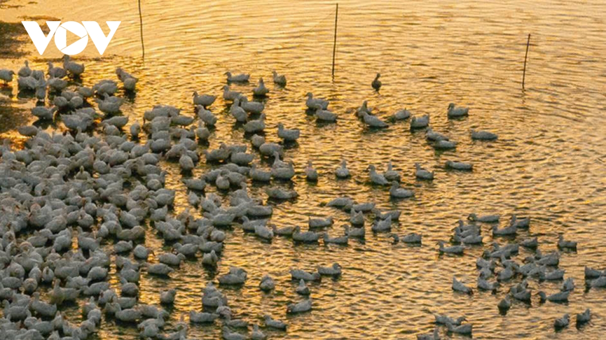 Ánh hoàng hôn vàng óng rót xuống, biến đàn vịt thành những vệt sáng lấp lánh, tạo nên một khung cảnh tuyệt đẹp. (Ảnh: Vũ Khoa)