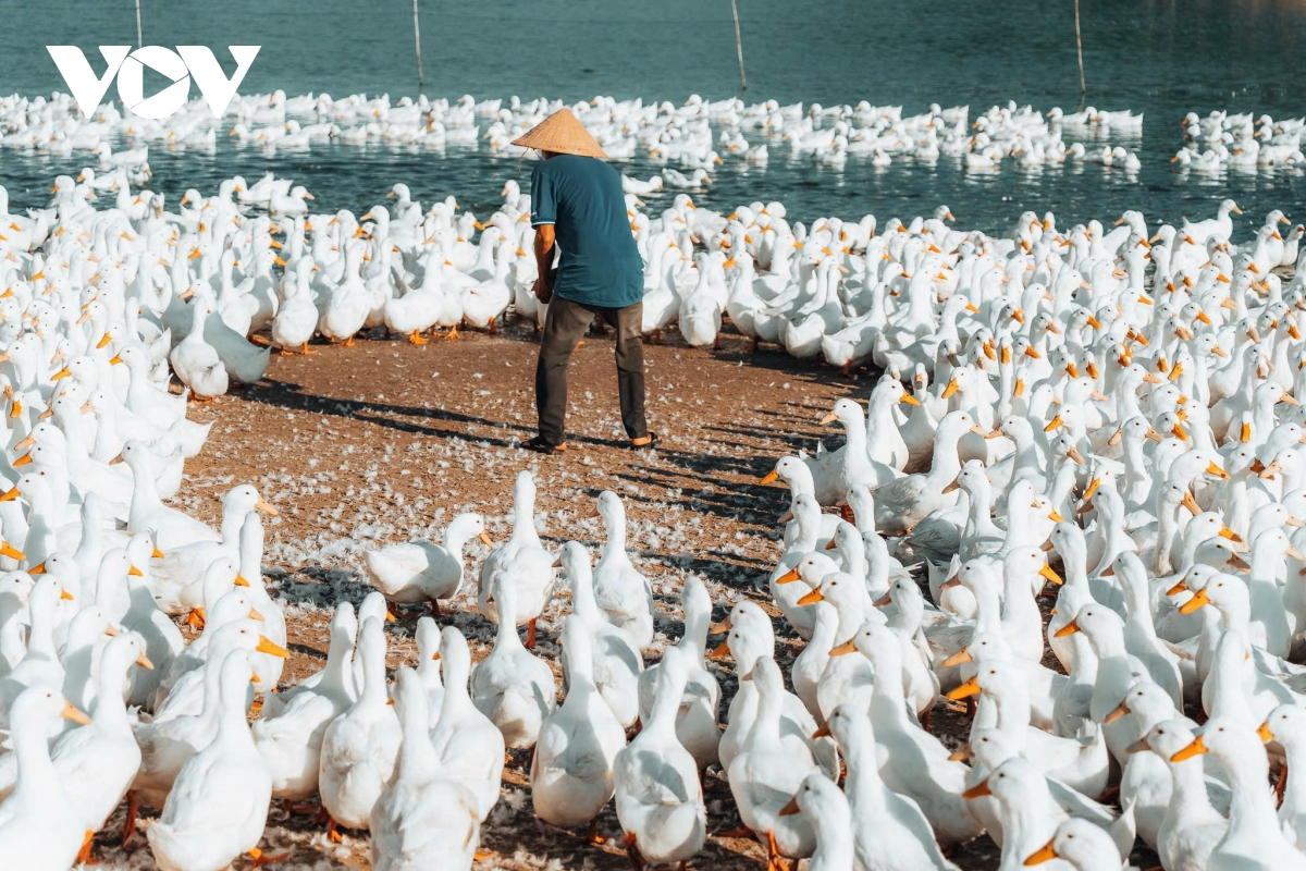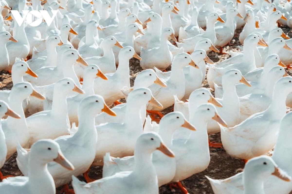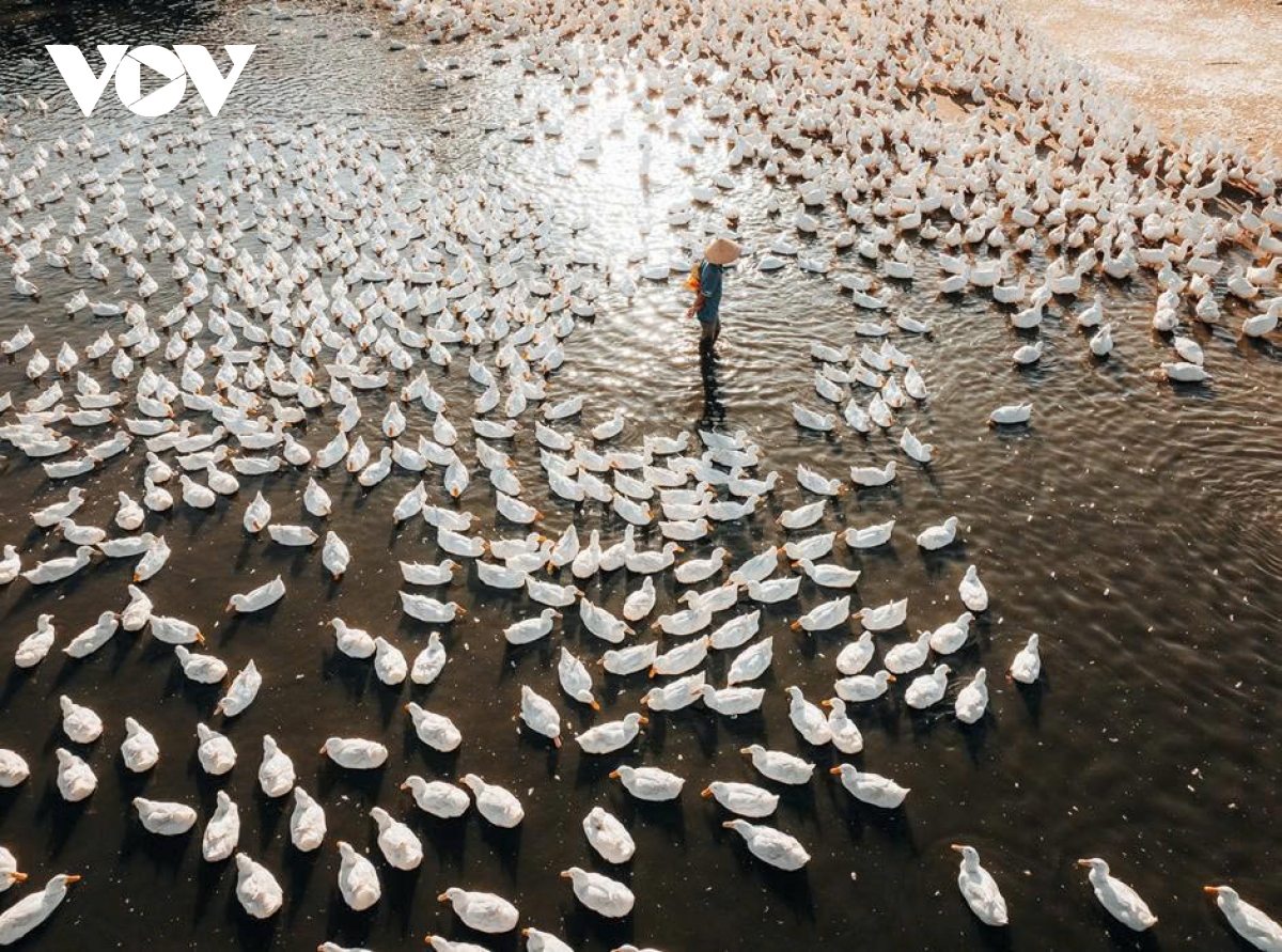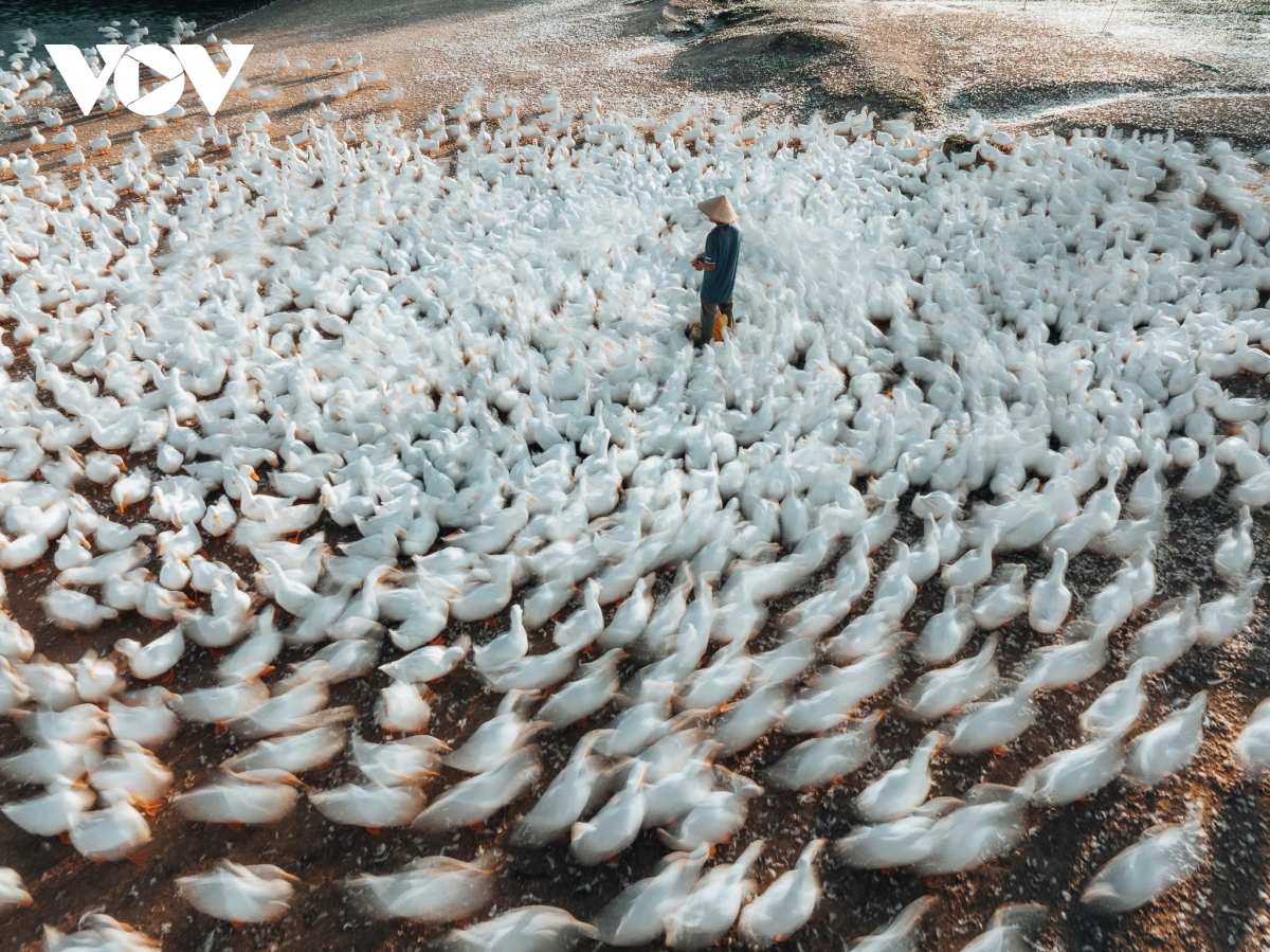 Những chiếc mỏ vàng cam nổi bật trên nền lông trắng, từng nhịp di chuyển đều đặn khiến khung cảnh trở nên như một bức tranh sống. Nhờ vào chúng mà nơi lao động đời thường bỗng khoác lên vẻ đẹp nghệ thuật, mộc mạc mà cuốn hút. (Ảnh: Vũ Khoa)