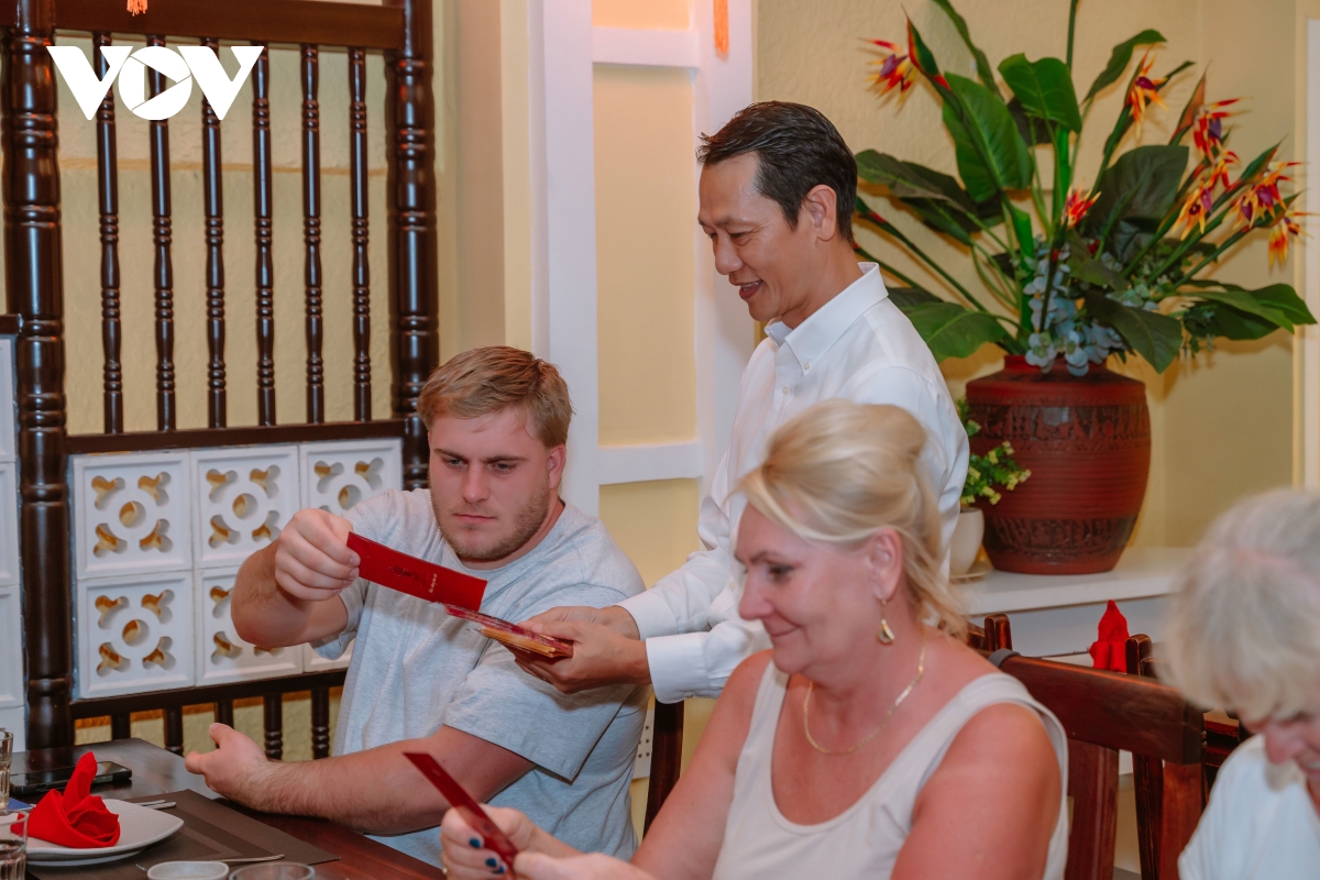 Du khách quốc tế nhận lì xì - một nét đẹp văn hoá truyền thống ngày Tết của người Việt.
