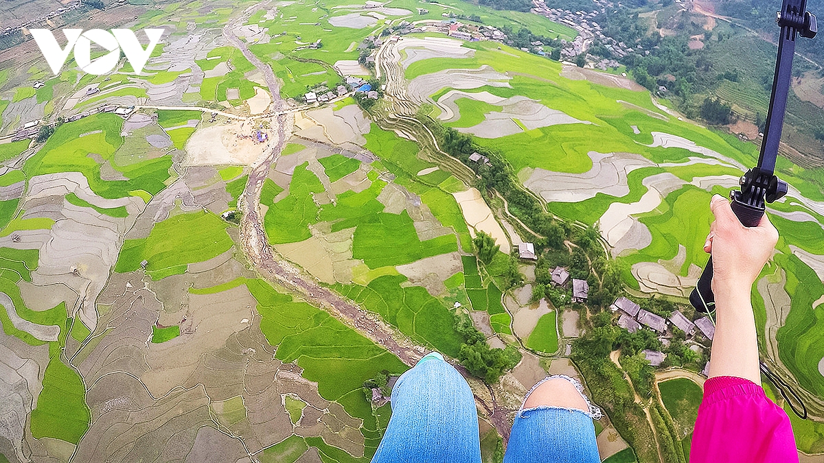 Ngắm thung lũng Lìm Mông mùa nước đổ và ghi lại những bức hình kỷ niệm độc đáo từ trên những cánh dù luôn là trải nghiệm không thể quên đối với mỗi du khách khi đến Mù Cang Chải