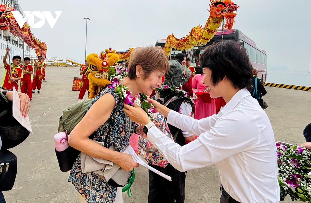 Khách du lịch Nhật Bản trên chuyến tàu biển Pacific World được chào đón khi cập cảng Hạ Long
