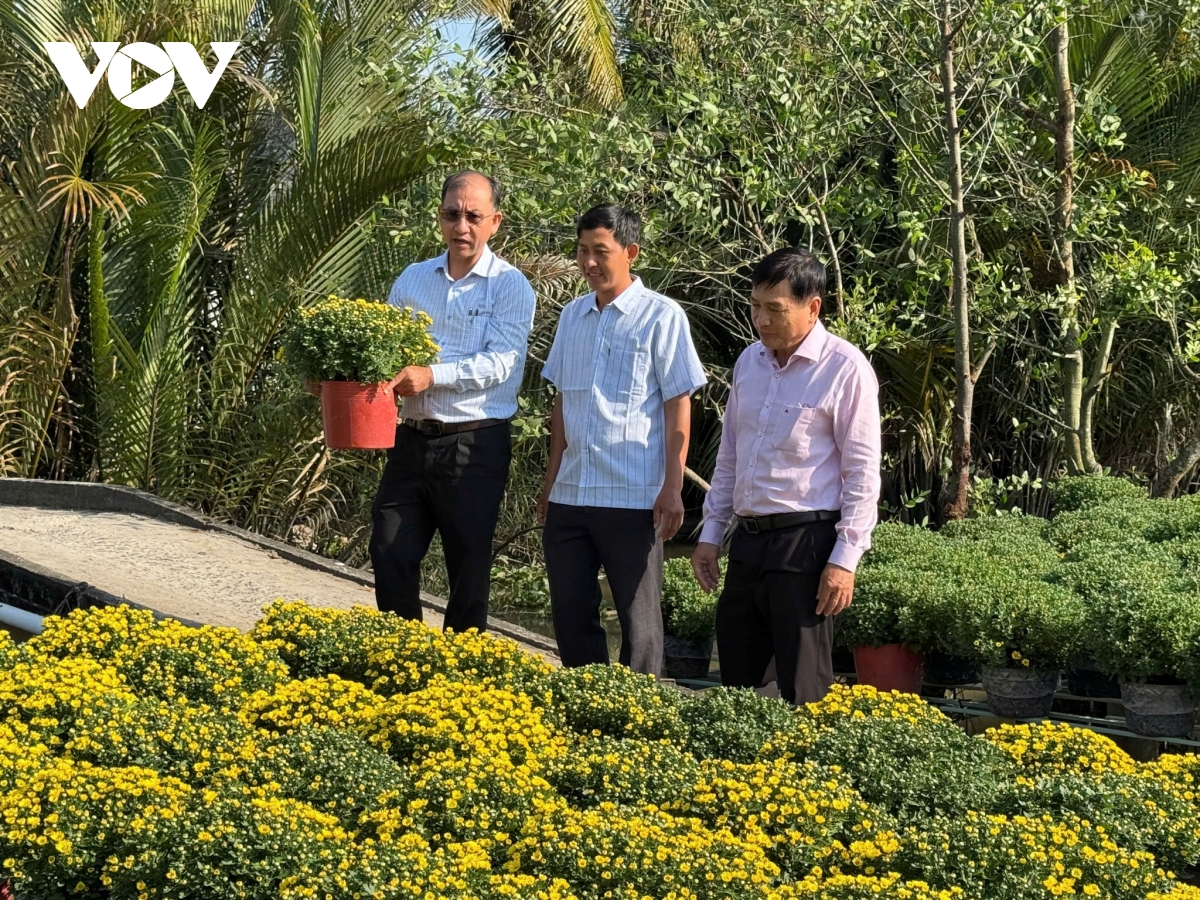 Ông Nguyễn Trung Nghĩa - Bí thư Đảng ủy xã Phong Điền (bìa trái) thăm hộ dân trồng hoa phục vụ thị trường Tết