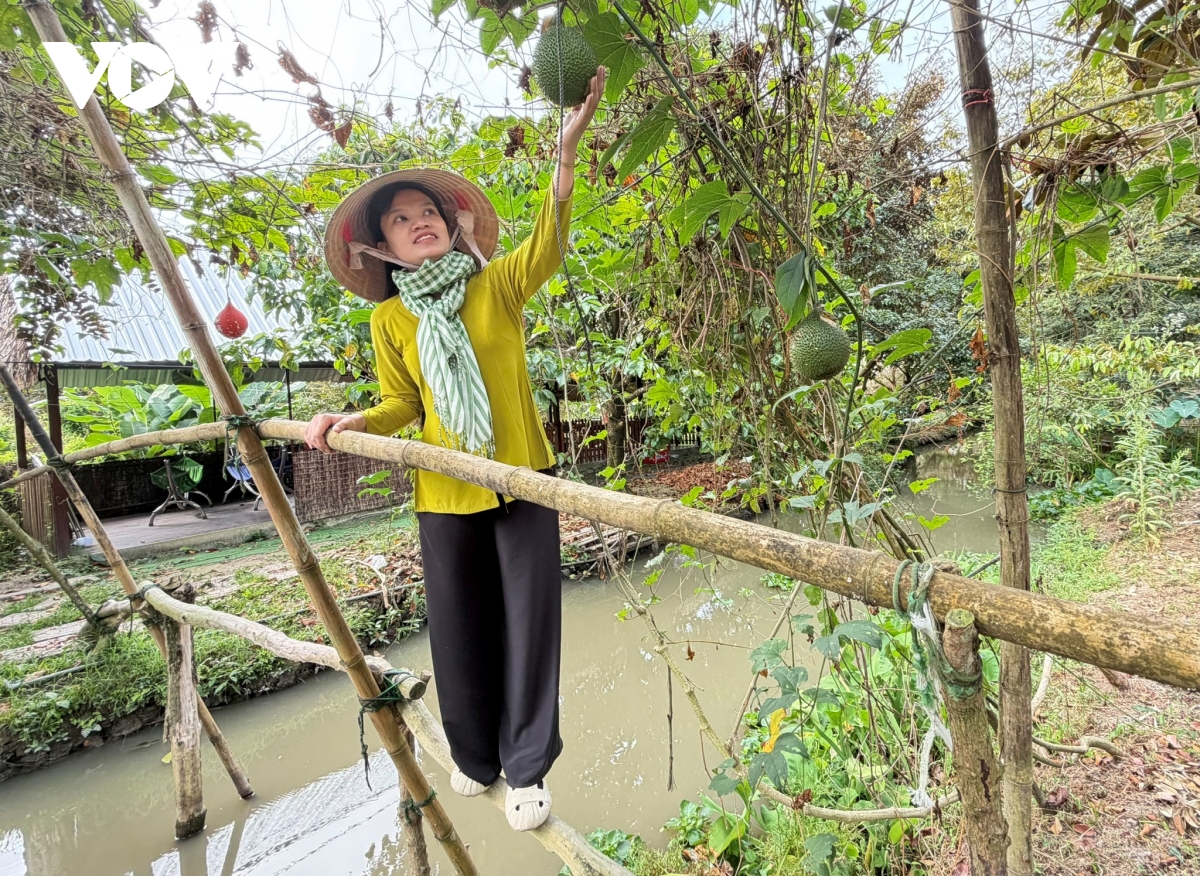 "Ngày xưa thì ô tô không vào được, bây giờ thì đường thuận lợi lắm, có xe vào tới nhà, tới vườn luôn. Vô đây du khách thích nhất là bơi ghe, câu cá, hái trái. Cá thì dưới mương, cứ khách câu lên muốn chế biến như thế nào thì cô làm theo, ví dụ như làm lẩu chua, cá lóc nướng trui, lẩu mắm... Các loại rau quả do cô trồng, có rau muống, cải xanh, chuối hột...", bà Trương Thị Hoa Lài chia sẻ.